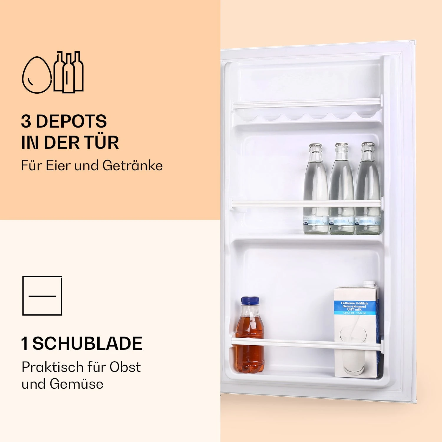 Der Klarstein 90L1-WH ist ein funktionaler, moderner Kühlschrank für die Kühlung von Speisen und Getränken – optimal für den Haushalt von 2-3 Personen. Trotz seiner kompakten Größe ergänzt ein separates Eisfach den großzügigen Stauraum des Kühlschranks. Zur Innenausstattung gehören zudem zwei Regaleinschübe, eine Schublade und 3 Türfächer für Eier und Getränke.