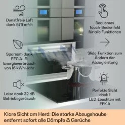 Beste Luft in der Küche: Die Klarstein Alessia Dunstabzugshaube verleiht Küchen einen edlen Glanzpunkt und beseitigt schwungvoll Dampf und Dunst beim Kochen.